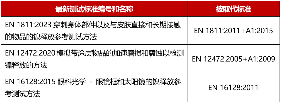 即日起,用于证明符合REACH法规附录XVII第27项镍释放要求的测试标准清单将如下: